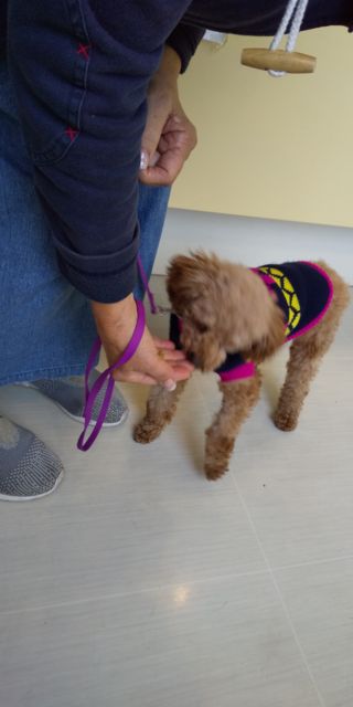 途中、ポキールは会場内で支援者のご家族に可愛がってもらって社会化の練習をしてもらいました
