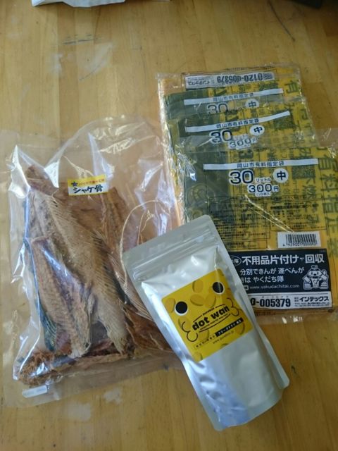 レナちゃんからはおやつと乾燥納豆と岡山市のゴミ袋を頂きました!